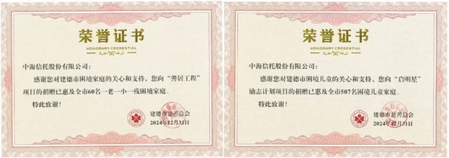 近日,中海信托股份有限公司(以下简称“中海信托”或“公司”)收到了来自建德市慈善总会的感谢信,感谢公司通过“中海和善—善德建业1号慈善信托”对建德市多个公益项目的大力支持。